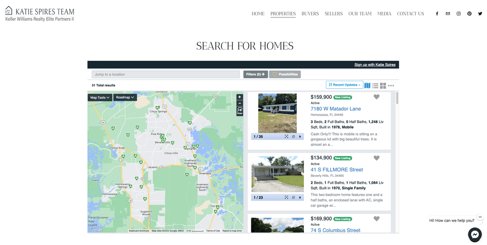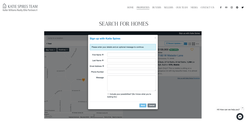 As you find homes that you like there is an option to save the home as a possibility by clicking the heart by the property. Once you have selected the homes that are of interest to you, you can view them all by clicking ‘Possibilities at the top of the box. Within that box, you can click on ‘Sign Up with Katie Spires’ in blue text at the bottom of your list.
